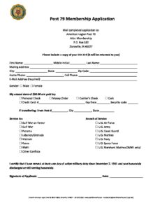 Click here to download and print an application. You may then mail or bring it in to the Post along with your dues and eligibility documentation (DD214). Documents will be returned to you. There is no fee or additional dues required if you are transferring a current year membership from another post.
